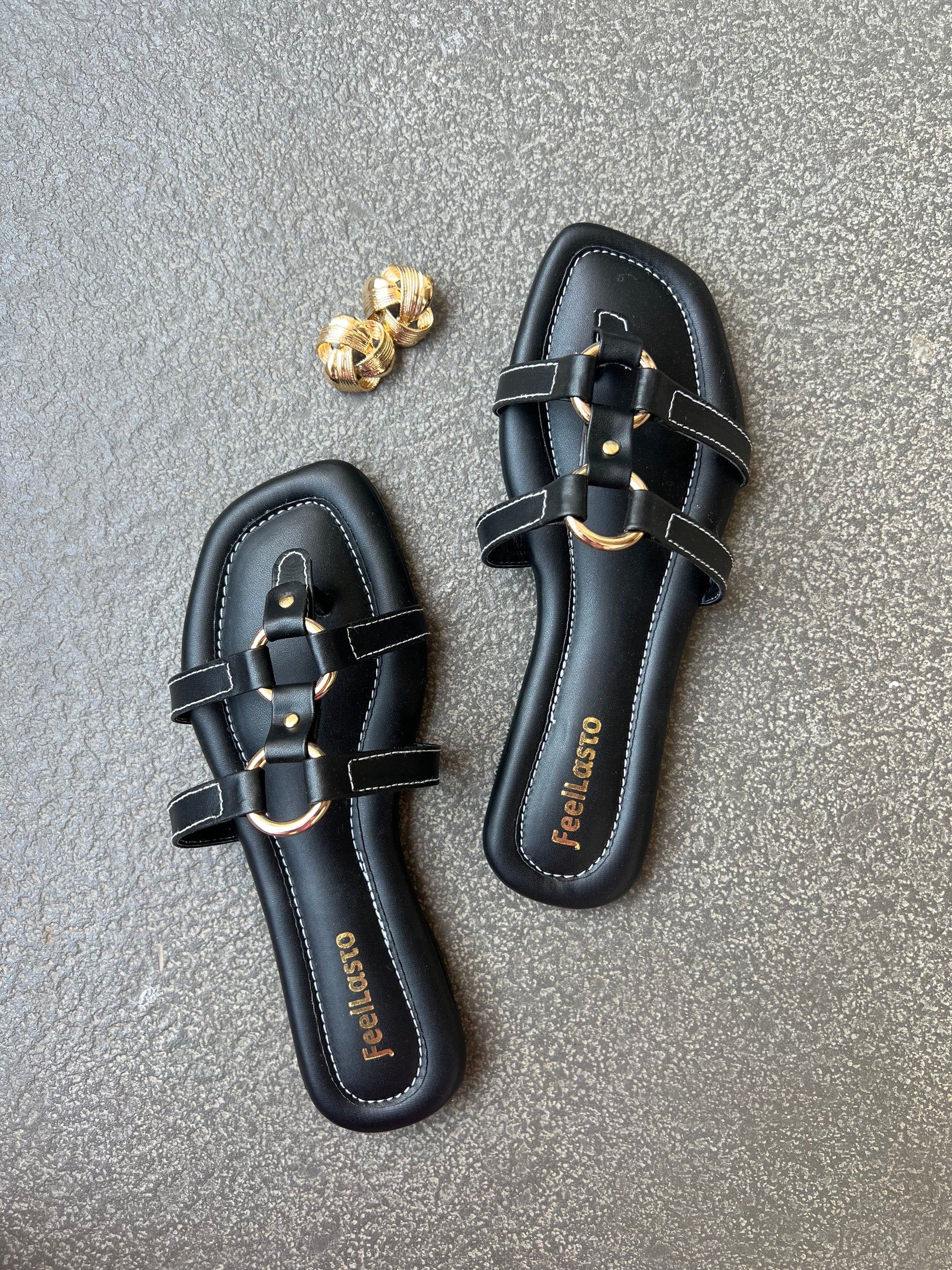 Elegant black flats featuring toe support, golden ring detailing, and full cushioning — designed for all-day comfort and timeless style.