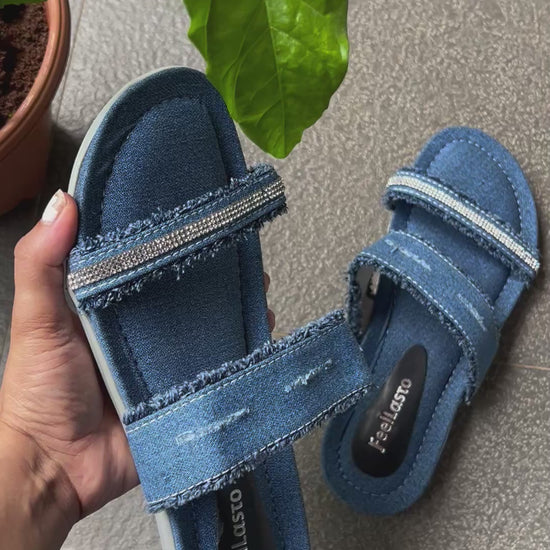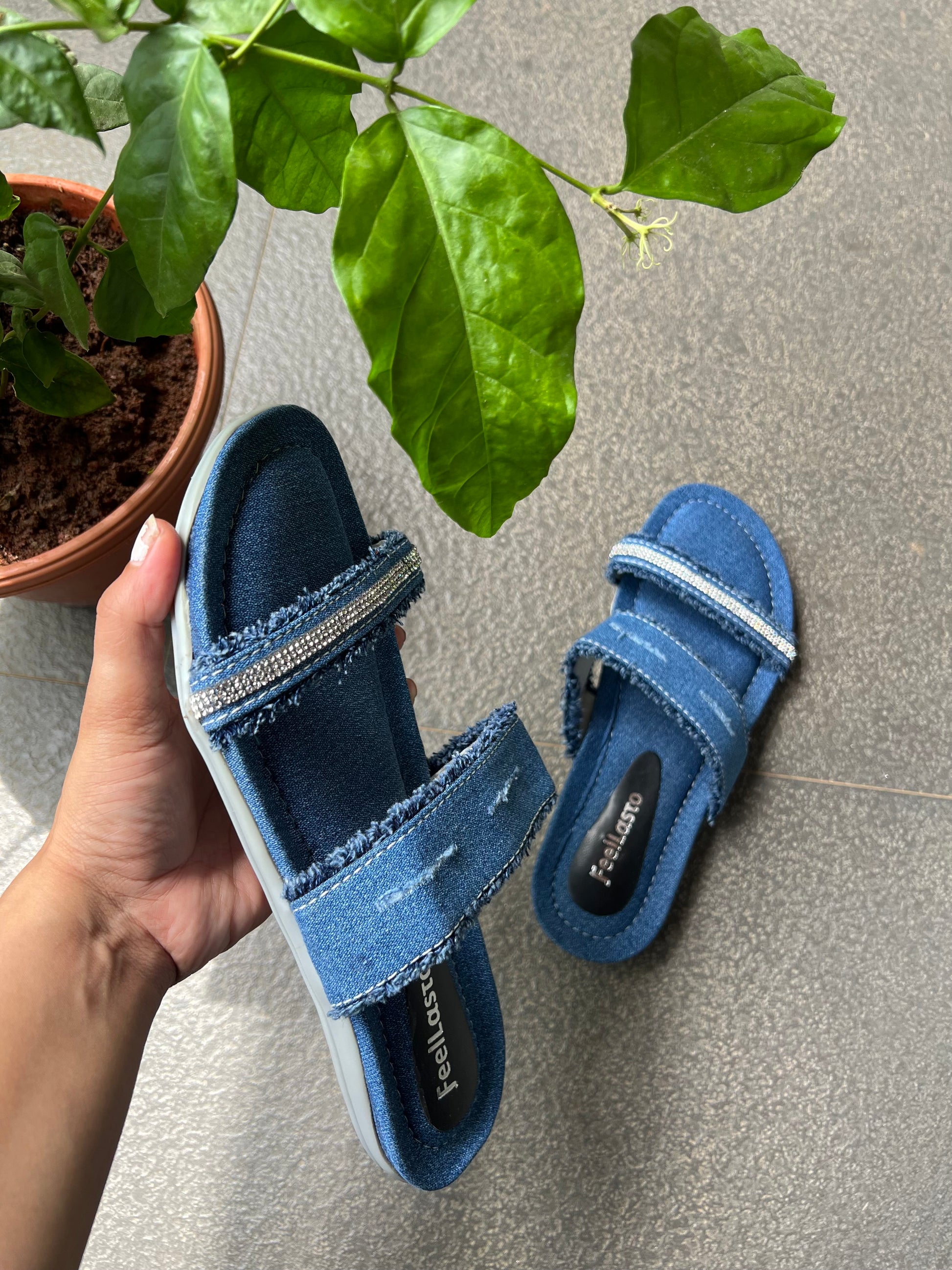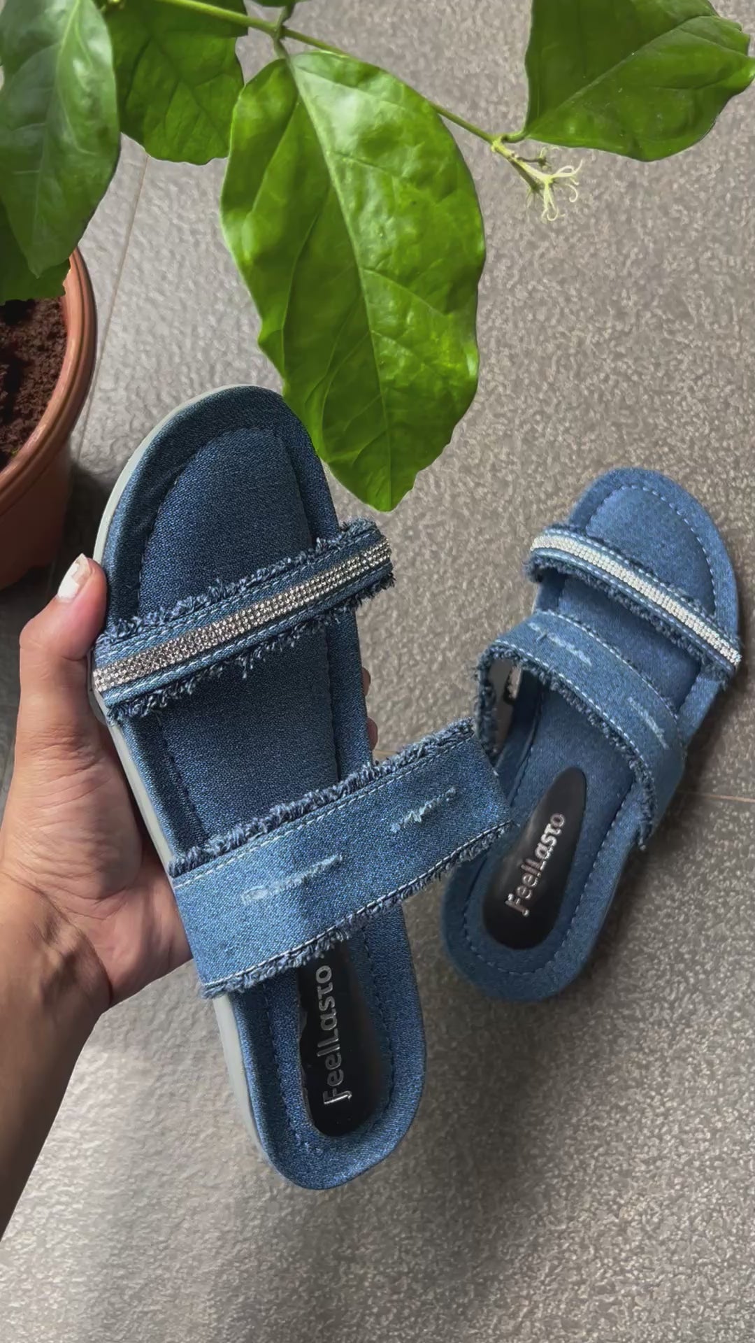Denim comforters featuring a unique two-strap design—one with subtle diamond embellishments and the other in classic denim. Fully cushioned for maximum comfort, making them perfect for all-day wear. A stylish blend of sparkle and casual chic, ideal for both everyday outings and elevated casual looks.