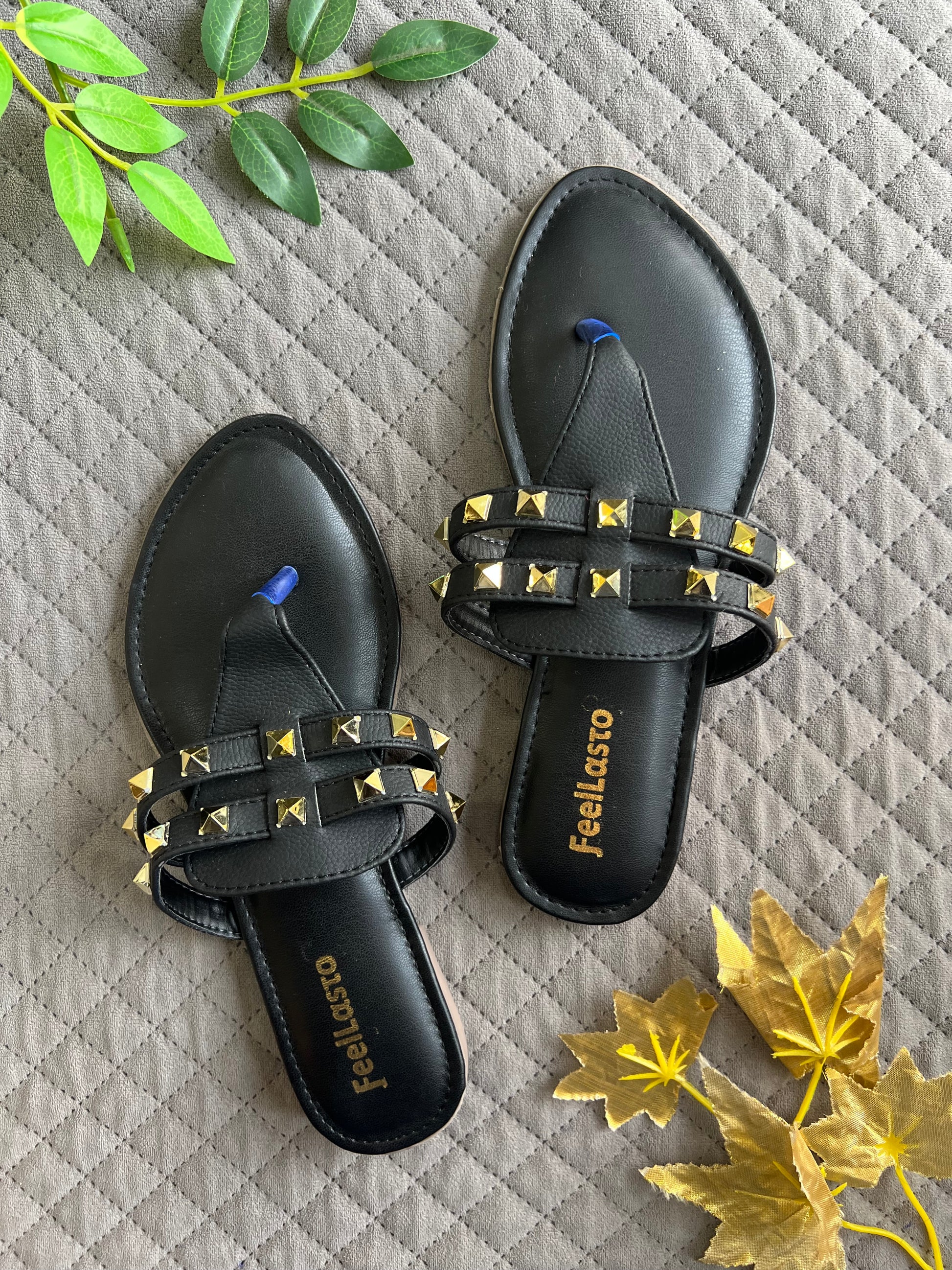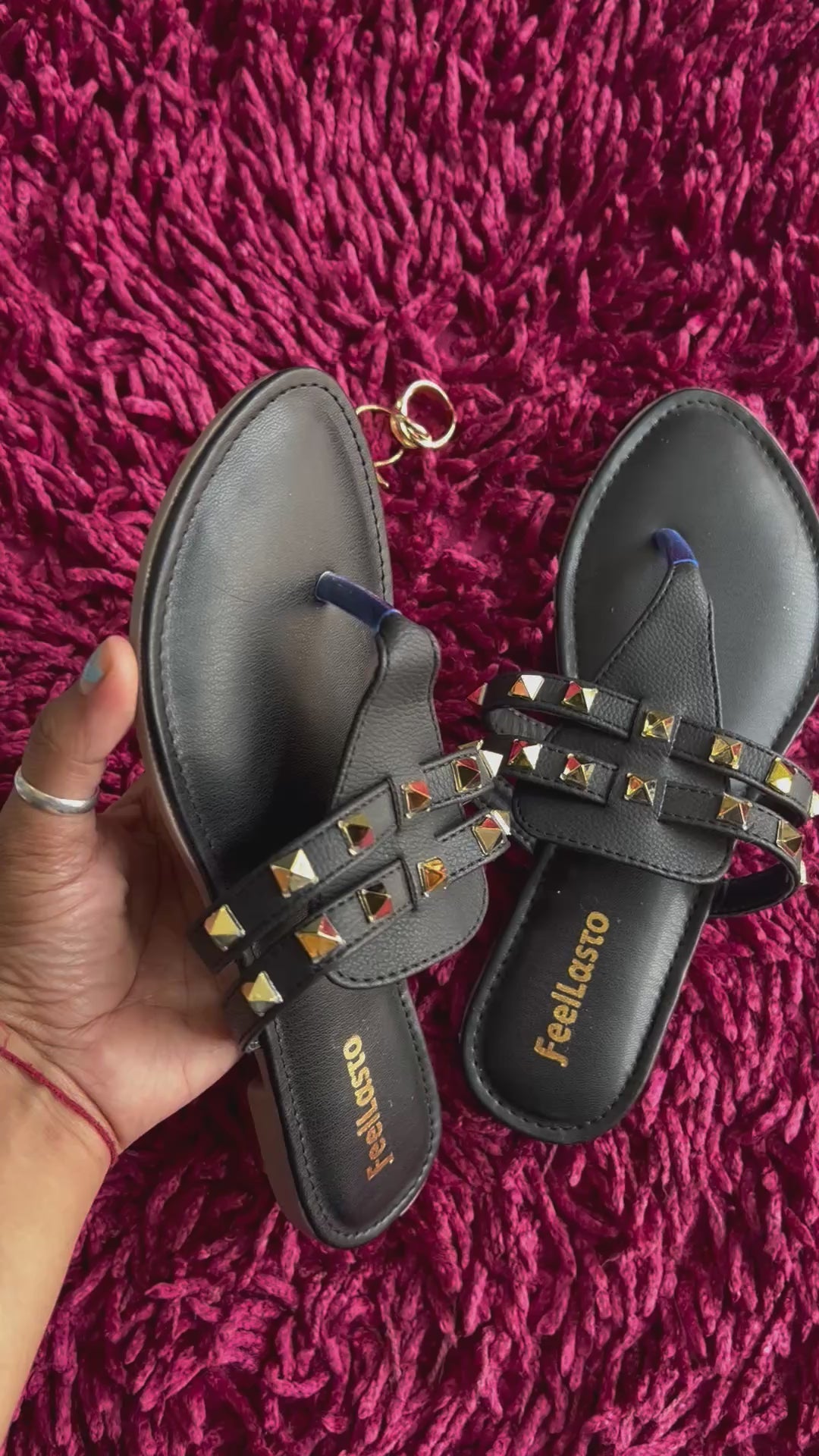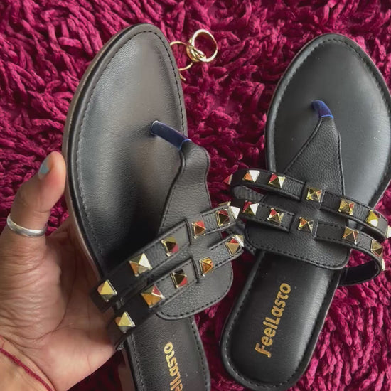 Elegant black flats featuring golden square beads, crafted to blend traditional charm with modern flair. Designed with full cushioning and toe support for all-day comfort, these versatile flats pair beautifully with both Indian and Western outfits.