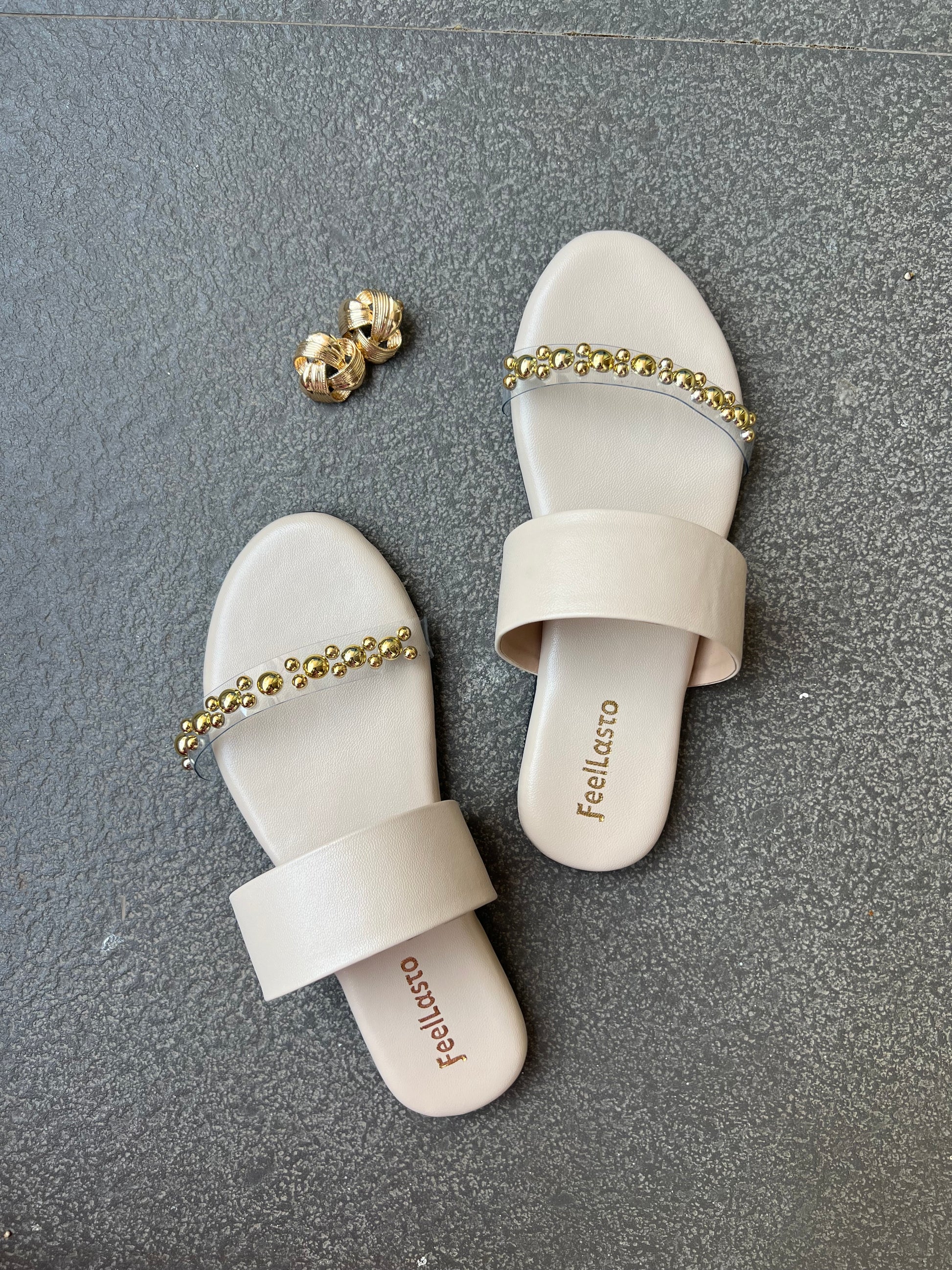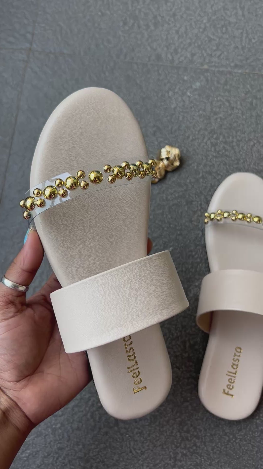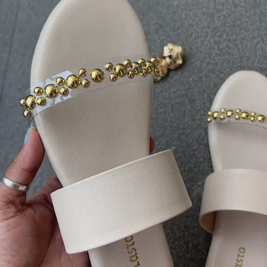 Elegant cream flats featuring a transparent strap and delicate golden beads for a chic touch. Designed with full cushioning for all-day comfort, these versatile flats effortlessly complement both Indian and Western outfits. Perfect for everyday elegance or festive flair.